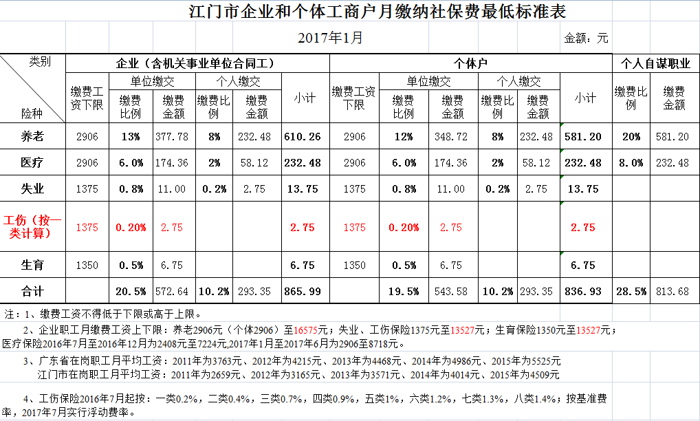 江门市企业和个体工商户月缴纳社保费最低标准表(2017年1月)
