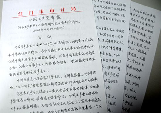 近期,市审计局党支部收集了全体党员和入党积极分子的《中国共产党章程》手抄本,并将书写工整美观的优秀作品在微信等平台进行展示。