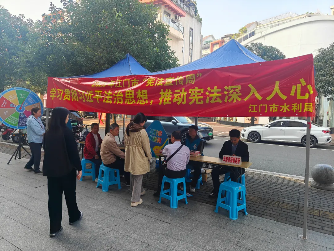 今年12月4日是第十二个国家宪法日,2025年国家宪法日及“宪法宣传周”活动主题为“学习贯彻习近平法治思想,推动宪法深入人心”。为深入贯彻习近平法治思想,切实落实“谁执法谁普法”普法责任制,在国家宪法日当天,江门市水利局组织普法宣传员和志愿者走进江华社区党群服务中心,开展宪法及水法律法规宣传志愿服务活动,让法治精神扎根基层、浸润民心。