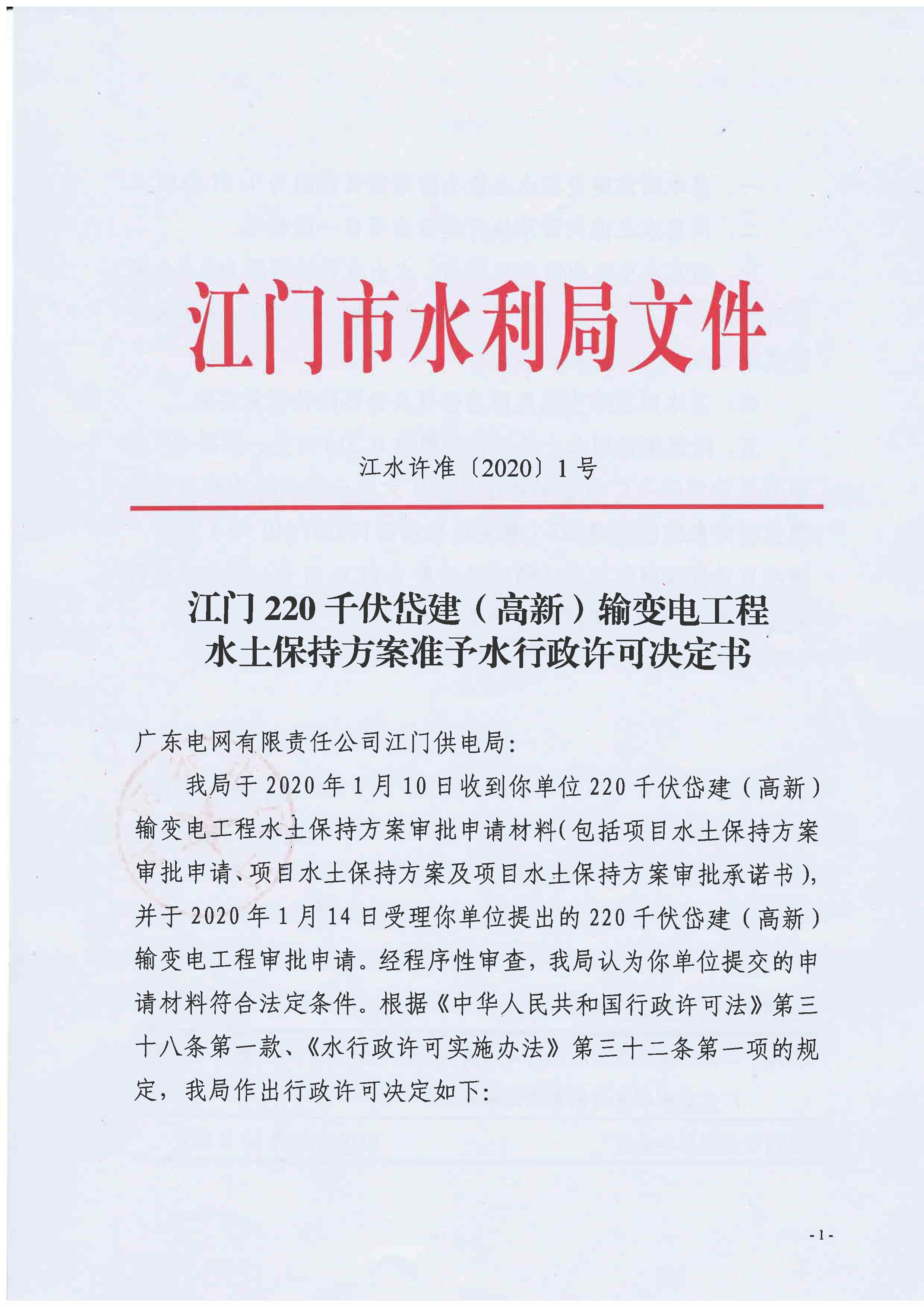 江门220千伏岱建(高新)输变电工程水土保持方案准予水行政许可决定书