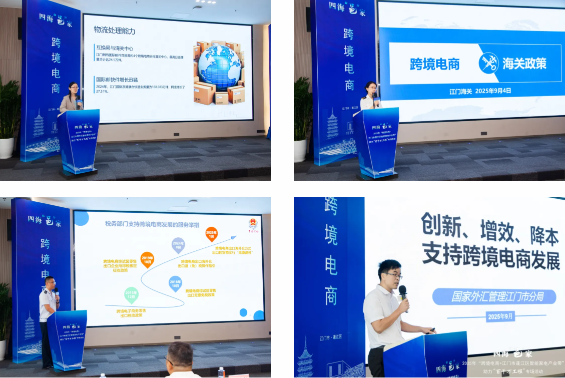 活动上,江门市商务局对江门市跨境电商产业带作了重点推介,江门海关、江门市税务局、国家外汇管理局江门市分局分别针对跨境电商带来政策宣讲,为今后的跨境电商发展指明方向。江门人才岛科技产业园作为蓬江区知名的电商园区,也是蓬江区推进落实“跨境电商+智能家电产业带”的试点和重要载体,为电商企业宣讲园区配套和优惠政策,助力电商企业快速成长。
