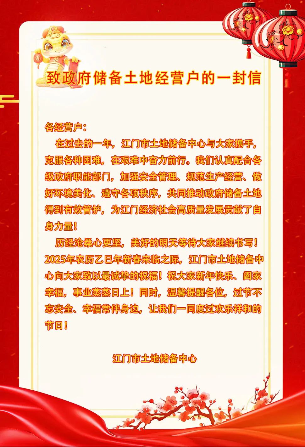 致政府储备土地经营户的一封信