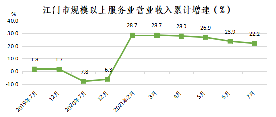 2021年1-7月,我市规模以上服务业保持稳定恢复,实现营业收入122.64亿元,同比增长22.2%;两年平均增长10.4%,较1-6月提升0.1个百分点。