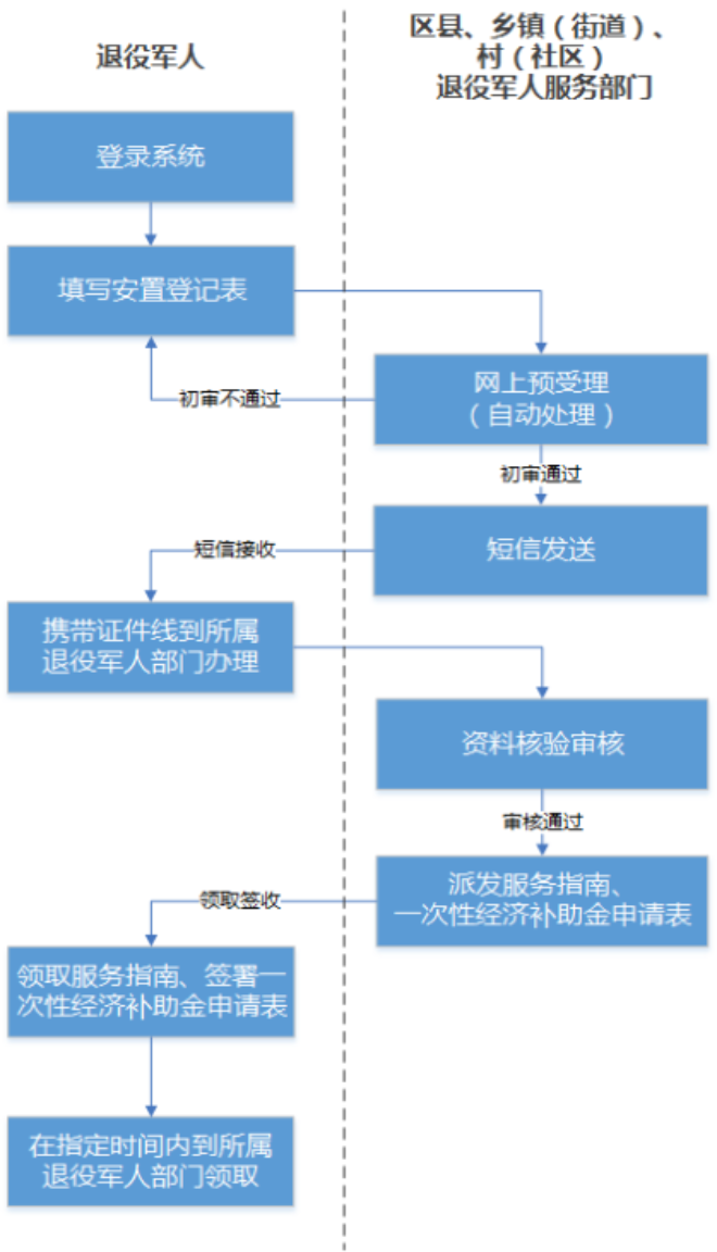 (一)退役军人接收预报到实行网上填报的方式:退役军人可通过登陆指定网站按页面指引如实填写相关信息,并在网上提交,于规定的时间内携带相关证件资料到报名当地退役军人事务部门报到。