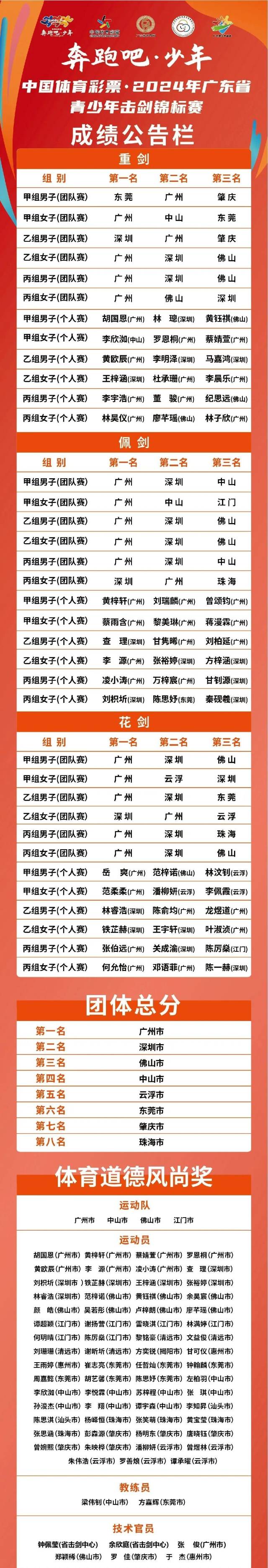 2024年8月9日,中国体育彩票·2024年广东省青少年击剑锦标赛在广东珠西国际会展中心精彩收官。该赛事是由广东省体育局主办,江门市文化广电旅游体育局承办,广东省击剑协会、江门市蓬江区文化广电旅游体育局、江门滨江华体体育会展中心有限公司协办,广东省体育彩票中心支持。旨在为全省击剑运动员搭建技术交流的实战平台,对于我省选拔击剑后备人才及建设梯队有着重要意义。同时发挥赛事溢出效应,让更多人关注、参与击剑运动,促进击剑运动普及和发展。