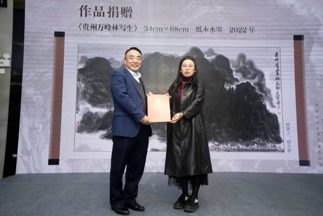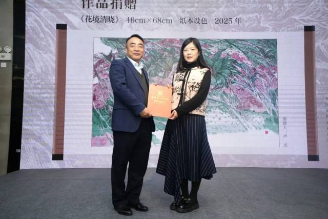 艺术家郝文静、卢贞作为女性艺术家代表,分别将纸本水墨作品《贵州万峰林写生》、纸本设色作品《花境清晓》无偿捐赠给江门市美术馆永久收藏。江门市文化广电旅游体育局局长邝积康作为代表接受捐赠作品,并向两位艺术家颁发收藏证书。