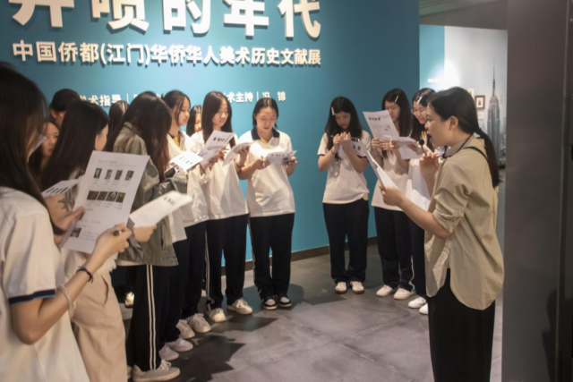 签约仪式结束后,市技师学院财务经管系学子走进“井喷的年代——中国侨都(江门)1869-2019华侨华人美术历史文献展”开启“大思政课”实践基地的首场情境式研学。在研学导师的带领下,青年学子通过“三重解码”研学模式(文献解码-图像解码-精神解码),系统考察江门华侨华人美术发展史:于侨批文书、历史照片等实物档案中触摸“海上丝绸之路”的文化记忆,在经典作品中解码“双重空间”的侨乡美学,在海外遗珍里感知中华民族的精神谱系。这种“物-史-魂”三位一体的研学体系,让学生真切感受我市150年来的“内外两个江门”的美术发展脉络和历史性成就,使静态展品转化为动态思政“活教材”,历史叙事具象化为价值塑造载体。