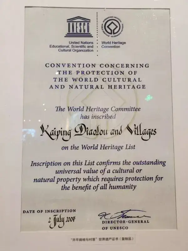 “开平碉楼与村落”申遗证书