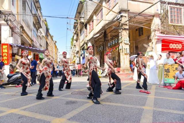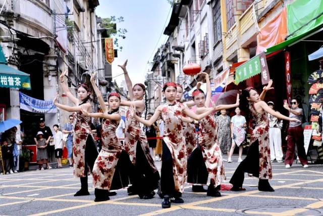 下午3:15分,身着各式精致服饰的年轻舞者们以街舞为媒,开启了一场时空对话。《上官婉儿》以现代肢体语言重构古典气韵,刚柔并济;《先生,我想写封信给你》则巧妙融合书信文化情怀,在动感中流淌深情;《大展宏图》以恢弘气势点燃现场,传递奋进力量;《行进音乐》更将表演化为流动的风景,舞者与市民、游客在骑楼街巷穿行互动,青春律动与历史光影交织共鸣。