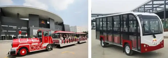 你可以乘坐观光车参观无限极新会生产基地,