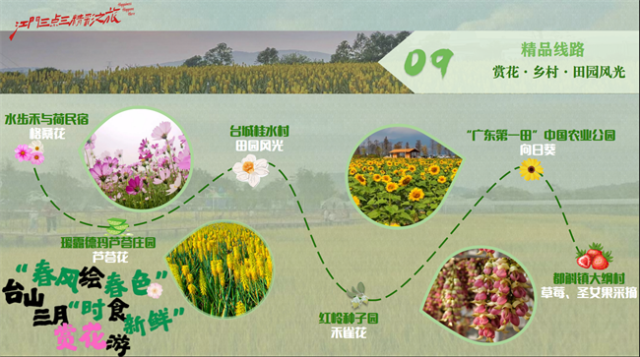 赏花游线路水步禾与荷民宿(格桑花)——瑷露德玛芦荟庄园(芦荟花)——台城桂水村(田园风光)——红岭种子园(禾雀花)——都斛台山中国农业公园(向日葵)——都斛镇大纲村(草莓、圣女果采摘)