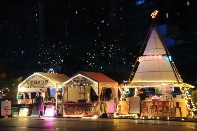 在这里,无需翻山越岭,天幕、露营椅、大荧幕、小吧台和一份份夜市小吃、冰爽饮品,就能让你感受到,这座城市的专属夜趣。