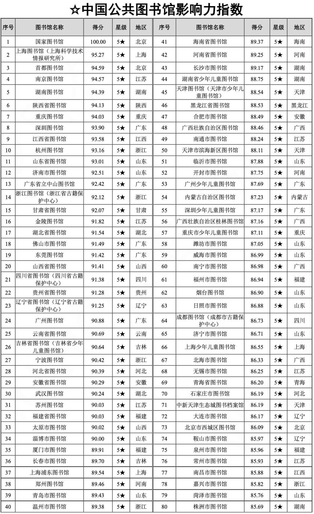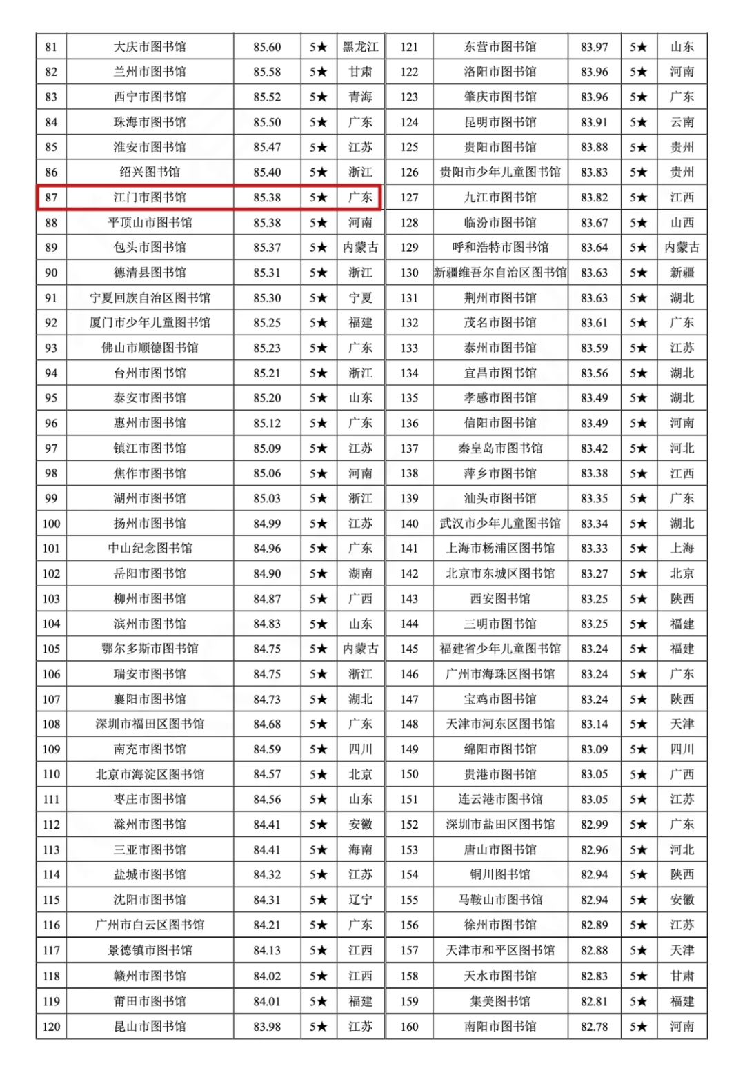 2025年12月29日,由武汉大学中国科学评价研究中心与数字出版智能服务技术教育部工程研究中心联合研发的《数智时代中国图书馆影响力指数报告(2025)》正式发布。江门市图书馆从全国1980家公共图书馆中脱颖而出,位列“中国公共图书馆影响力指数”排行榜第87名、广东地区第9名。
