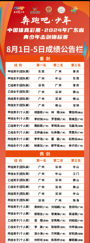 2024年8月5日,中国体育彩票·2024年广东省青少年击剑锦标赛第一阶段比赛已顺利结束。为期五天的激烈比拼,甲乙丙组别男女子佩剑、重剑的个人赛和团体赛以循环赛和淘汰赛制进行,最终共决出24个项目的冠亚季军。