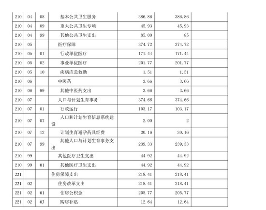 3、医疗卫生与计划生育(类)医疗卫生管理事务(款)行政运行(项)决算支出2.39万元;其他医疗卫生管理事务(项)决算支出5万元;公立医院(款)综合医院(项)决算支出11.44万元;中医(民族)医院(项)决算支出59.61万元;职业病防治医院(项)决算支出171.92万元;其他专科医院(项)决算支出120万元;其他公立医院支出(项)401.73万元;基层医疗卫生机构(款)乡镇卫生院(项)决算支出1050万元;其他基层医疗卫生机构(项)决算支出5万元;公共卫生(款)疾病预防控制机构(项)决算支出251.02万元;卫生监督机构(项)决算支出116.93万元;妇幼保健机构(项)决算支出300万元;其他专业公共卫生机构(项)决算支出83.57万元;基本公共卫生服务(项)决算支出874.9万元;重大公共卫生专项(项)决算支出808.61万元;突发公共卫生事件应急处理(项)决算支出252.42万元;其他公共卫生支出(项)决算支出72.88万元;医疗保障(款)疾病应急救助(项)决算支出28.38万元;中医药(款)中医(民族医)药专项(项)决算支出67.7万元;人口与计划生育事务(款)人口和计划生育信息系统建设(项)决算支出3万元;计划生育避孕药具经费(项)决算支出4.39万元;流动人口计划生育管理和事务(项)决算支出34.32万元;人口和计划生育目标责任制考核(项)决算支出27.82万元;其他人口和计划生育事务(项)决算支出279.72万元;其他医疗卫生(款)其他医疗卫生(项)决算支出268.42万元。