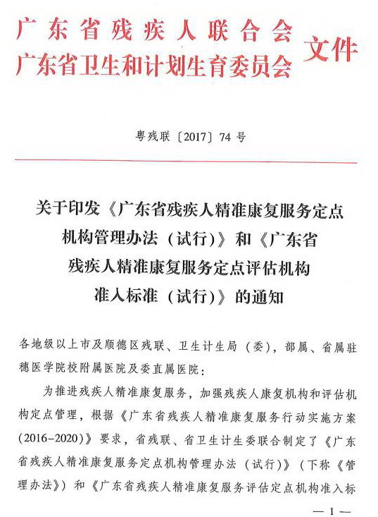 广东省残疾人精准康复服务定点机构管理办法(试行)》和《广东省残疾人精准康复服务定点评估机构准入标准(试行)》