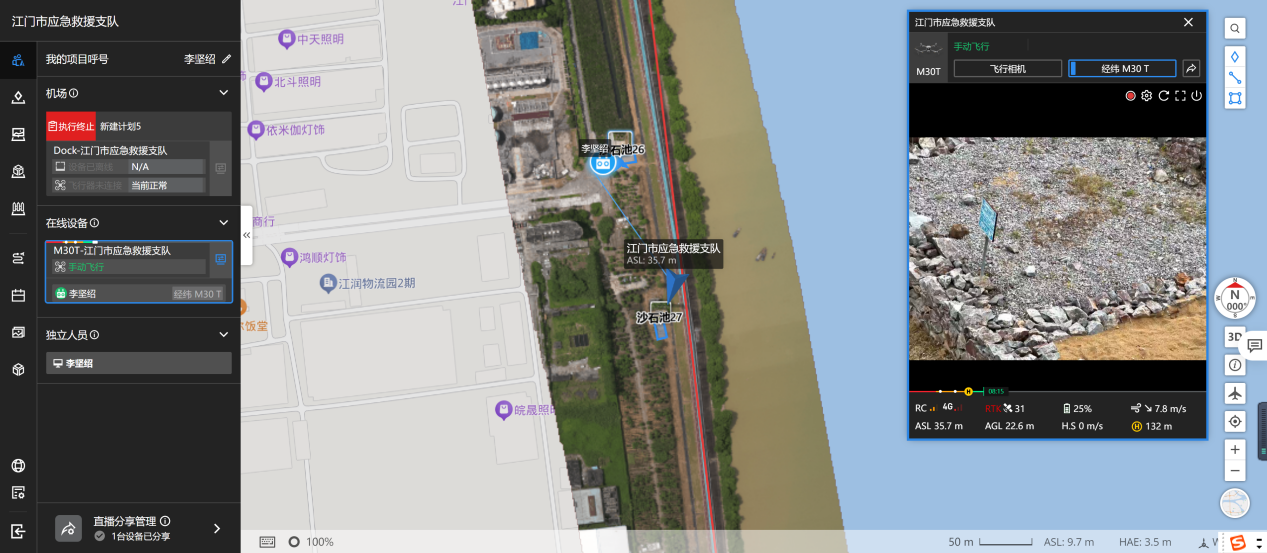 巡查小组由市应急救援支队负责人担任组长,救援支队六名通信组技术骨干担任组员。为保障巡查工作数据的精确度,巡查小组利用科技赋能,采取空地结合数据采集的方式,使用无人机空中建模、航拍等科技手段记录防汛抢险物资分布情况。同时,对每一个防汛沙石池进行实地测量,记录好经纬度坐标、砂石储备量和占地面积等具体信息,并逐一整理编号。最后利用无人机云端管理平台进行二维建模、制作巡航标记视频和物资储备信息统计表。