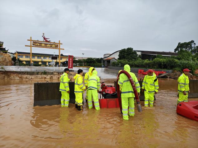 受台风“韦帕”影响,22日上午,新会区南部遭遇持续3小时强降雨,累计雨量达100毫米;鹤山市共和镇降雨超90毫米,引发两地大面积水涝灾害。13时25分,市应急救援支队迅速调派26名抢险队员,携带龙吸水子母排洪车、液压排涝泵等专业装备,兵分两路赶赴新会区大泽镇仁和村、鹤山市共和镇八景山庄,全力开展应急排涝工作,确保群众生命财产安全。