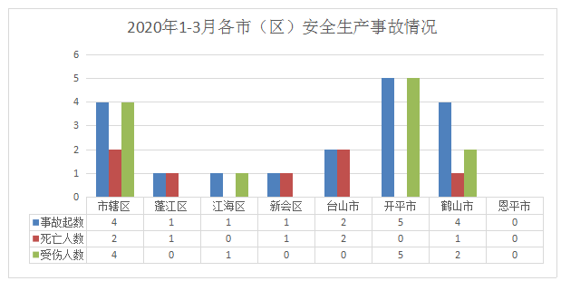 1-3月,市辖区发生事故4起(其中道路运输事故3起、水上运输事故1起);蓬江区发生道路运输事故1起;江海区发生道路运输事故1起;新会区发生其他行业事故1起;台山市发生事故2起(其中道路运输事故1起,商贸制造业事故1起);开平市发生道路运输事故5起;鹤山市发生事故4起(其中道路运输事故3起、其他行业事故1起);恩平市未发生生产安全事故。