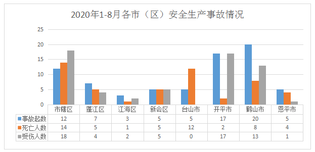 1-8月,市辖区发生交通运输和仓储业事故12起(其中道路运输10起、水上运输2起);蓬江区发生事故7起(其中商贸制造业1起、建筑业1起、交通运输和仓储业5起);江海区发生交通运输和仓储业事故3起;新会区发生事故5起(其中农、林、牧、渔业1起、商贸制造业1起、交通运输和仓储业2起、其他事故1起);台山市发生事故5起(其中农林牧渔业1起、交通运输和仓储业4起);开平市发生交通运输和仓储业事故17起;鹤山市发生事故20起(其中商贸制造业1起、交通运输和仓储业18起、其他行业1起);恩平市发生事故5起(其中商贸制造业1起、建筑业1起、交通运输和仓储业3起)。