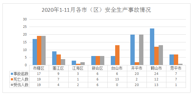 1-11月,市辖区1发生交通运输和仓储业事故17起(其中道路运输14起、水上运输3起);蓬江区发生事故9起(其中商贸制造业2起、建筑业1起、交通运输和仓储业6起);江海区发生交通运输和仓储业事故3起;新会区发生事故6起(其中农林牧渔业1起、商贸制造业2起、交通运输和仓储业3起);台山市发生事故6起(其中农林牧渔业1起、交通运输和仓储业5起);开平市发生交通运输和仓储业事故20起;鹤山市发生事故24起(其中商贸制造业4起、建筑业1起、交通运输和仓储业18起、其他行业1起);恩平市发生事故7起(其中商贸制造业1起、建筑业2起、交通运输和仓储业4起)。