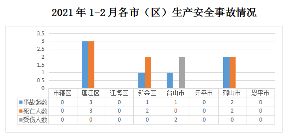 1-2月,蓬江区发生事故3起(其中建筑业2起、交通运输和仓储业1起);新会区发生交通运输和仓储业事故1起;台山市发生商贸制造业事故1起;鹤山市发生事故2起(其中商贸制造业1起、交通运输和仓储业1起);市辖区1、江海区、开平市和恩平市均未有生产安全事故发生。