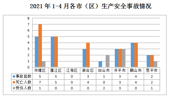 1-4月,市辖区1发生事故5起(其中道路运输2起、水上运输2起,其他行业事故1起);蓬江区发生事故5起(其中建筑业2起、交通运输和仓储业2起、其他行业事故1起);新会区发生事故3起(其中商贸制造业事故1起、交通运输和仓储业事故1起、其他行业事故1起);台山市发生商贸制造业事故1起;开平市发生交通运输和仓储业事故3起;鹤山市发生事故4起(其中商贸制造业2起、建筑业1起、交通运输和仓储业1起);恩平市发生事故2起(其中建筑业1起、交通运输和仓储业1起);江海区未有生产安全事故发生。