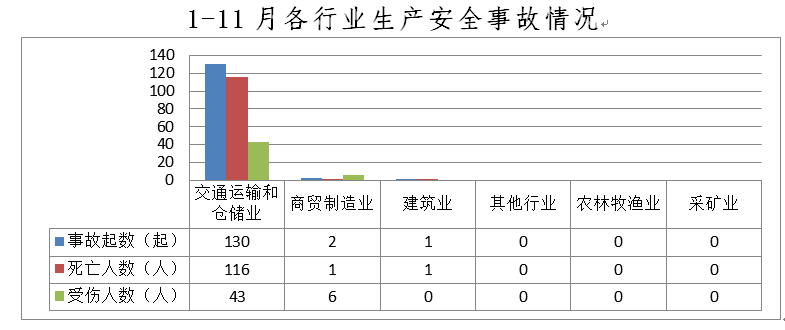 -11月,全市共发生生产安全事故133起,其中交通运输和仓储业130起(道路运输127起、水上运输3起)、占98%;商贸制造业2起,占1%;建筑业1起,占1%;农林牧渔业、采矿业和其他行业未发生生产安全事故。