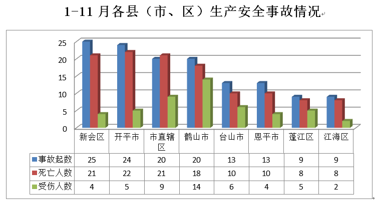 1-11月,新会区发生事故25起(其中建筑业事故1起、交通运输和仓储业事故24起);开平市发生交通运输和仓储业事故24起;市直辖区 发生事故20起(其中道路运输事故17起、水上运输事故3起);鹤山市发生事故20起(其中商贸制造业事故1起、交通运输和仓储业事故19起);台山市发生事故13起(其中商贸制造业事故1起、交通运输和仓储业事故12起);恩平市发生交通运输和仓储业事故13起;蓬江区发生交通运输和仓储业事故9起;江海区发生交通运输和仓储业事故9起。