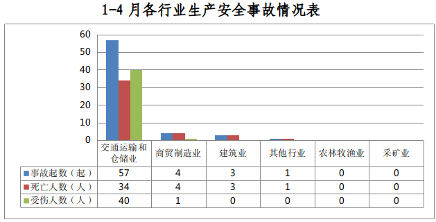 全市共发生生产安全事故65起,其中交通运输和仓储业57起、占88%,商贸制造业4起、占6%,建筑业3起、占5%,其他行业1起、占1%。农林牧渔业和采矿业未发生生产安全事故。