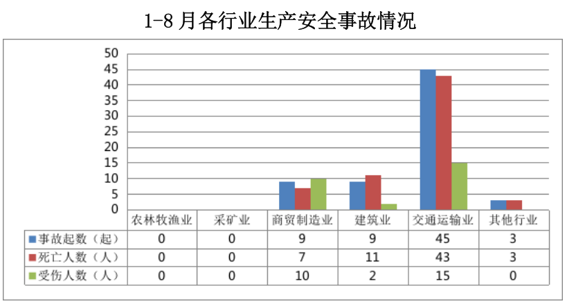 全市共发生生产安全事故66起,其中商贸制造业9起、占14%,建筑业9起、占14%,交通运输业45起、占68%,其他行业3起、占4%。农林牧渔业和采矿业未发生生产安全事故。