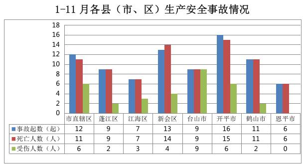 市直辖区事故12起,蓬江事故9起,江海事故7起,新会事故13起,台山事故9起,开平事故16起,鹤山事故11起,恩平事故6起。