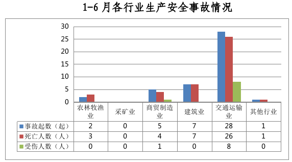 全市共发生生产安全事故43起,其中农林牧渔业2起、占5%,商贸制造业5起、占12%,建筑业7起、占16%,交通运输业28起、占65%,其他行业1起、占2%。采矿业未发生生产安全事故。