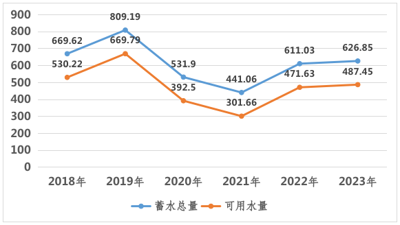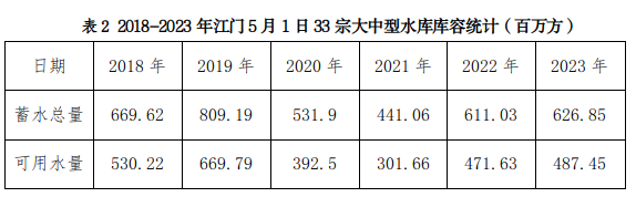 2018-2023年江门5月1日33宗大中型水库库容统计(百万方)