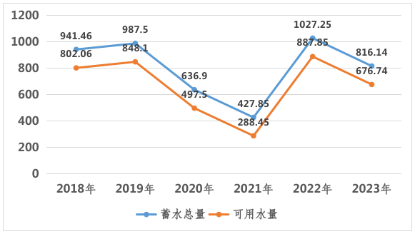 表2 2018-2023年江门7月1日33宗大中型水库库容统计(百万方)