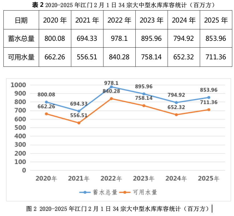 (三)水情:2025年1月份西江干流水道马口水文站月平均流量2160立方米每秒,较常年同期少21%。2025年2月1日,34宗大中型水库蓄水总量853.96百万方,较常年同期多2%,蓄水总量占总正常库容比例为65%,可用水量711.36百万方,占总兴利库容比例为61%;21宗供水水库蓄水总量601.69百万方,较常年同期多1%,可用水量480.15百万方,占兴利库容比例61%。