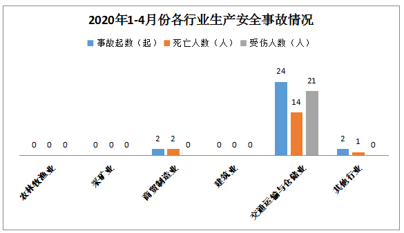 1-4月,全市共发生生产安全事故28起,其中商贸制造业2起,道路运输事故24起,其他行业事故2起。