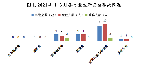 1-3月,全市共发生生产安全事故18起,其中商贸制造业4起、占22%;建筑业4起、占22%;交通运输和仓储业9起、占50%;其他行业1起、占6%。