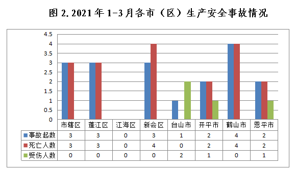 1-3月,市辖区1发生交通运输和仓储业事故3起(其中道路运输2起、水上运输1起);蓬江区发生事故3起(其中建筑业2起、交通运输和仓储业1起);新会区发生事故3起(其中商贸制造业事故1起、交通运输和仓储业事故1起、其他行业事故1起);台山市发生商贸制造业事故1起;开平市发生交通运输和仓储业事故2起;鹤山市发生事故4起(其中商贸制造业2起、建筑业1起、交通运输和仓储业1起);恩平市发生事故2起(其中建筑业1起、交通运输和仓储业1起);江海区未有生产安全事故发生。