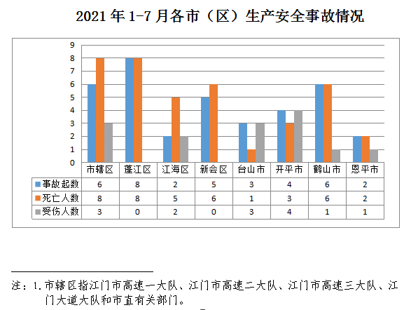 1-7月,市辖区1发生事故6起(其中道路运输3起、水上运输2起,其他行业事故1起);蓬江区发生事故8起(其中商贸制造业事故1起、建筑业3起、交通运输和仓储业3起、其他行业事故1起);江海区发生事故2起(其中建筑业事故1起、交通运输和仓储业1起);新会区发生事故5起(其中商贸制造业事故2起、建筑业1起、交通运输和仓储业事故1起、其他行业事故1起);台山市发生事故3起(其中农林牧渔业事故1起、商贸制造业事故1起、交通运输和仓储业事故1起);开平市发生交通运输和仓储业事故4起;鹤山市发生事故6起(其中商贸制造业3起、建筑业1起、交通运输和仓储业2起);恩平市发生交通运输和仓储业事故2起。
