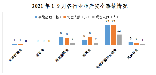 1-9月,全市共发生生产安全事故42起,其中交通运输和仓储业23起、占55%;商贸制造业9起、占22%;建筑业6起、占14%;其他行业3起、占7%;农林牧渔业1起、占2%。
