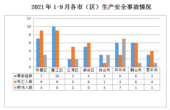 1-9月,市辖区发生事故7起(其中道路运输事故4起、水上运输事故2起,其他行业事故1起);蓬江区发生事故10起(其中商贸制造业事故2起、建筑业事故3起、交通运输和仓储业事故4起、其他行业事故1起);江海区发生事故2起(其中建筑业事故1起、交通运输和仓储事故业1起);新会区发生事故5起(其中商贸制造业事故2起、建筑业事故1起、交通运输和仓储业事故1起、其他行业事故1起);台山市发生事故3起(其中农林牧渔业事故1起、商贸制造业事故1起、交通运输和仓储业事故1起);开平市发生交通运输和仓储业事故6起;鹤山市发生事故6起(其中商贸制造业事故3起、建筑业事故1起、交通运输和仓储业事故2起);恩平市发生事故3起(其中商贸制造业事故1起、交通运输和仓储业事故2起)。