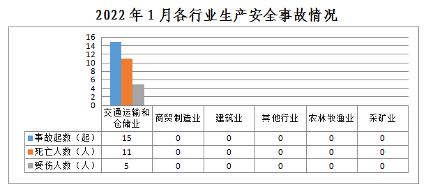 全市发生生产安全事故15起均为交通运输和仓储业,农林牧渔业、采矿业、商贸制造业、建筑业和其他行业未发生生产安全事故。