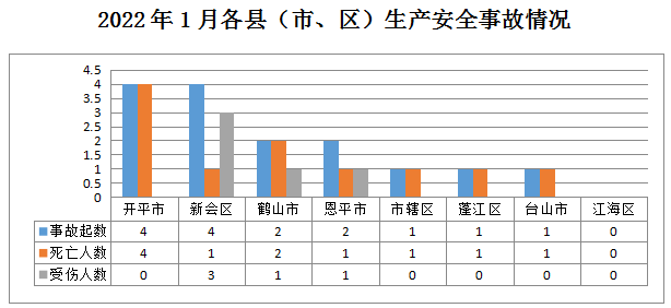 全市发生生产安全事故15起均为交通运输和仓储业:市辖区11起、蓬江区1起、新会区4起、台山市1起、开平市4起、鹤山市2起、恩平市2起;江海区未发生生产安全事故。