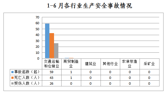 1-6月,全市共发生生产安全事故60起,其中交通运输和仓储业59起、占98%;商贸制造业1起,占2%;农林牧渔业、采矿业、建筑业和其他行业未发生生产安全事故。