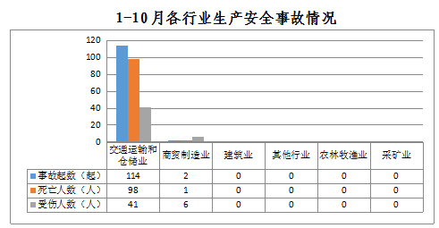 1-10月,全市共发生生产安全事故116起,其中交通运输和仓储业114起(道路运输111起、水上运输3起)、占98%;商贸制造业2起,占2%;农林牧渔业、采矿业、建筑业和其他行业未发生生产安全事故。