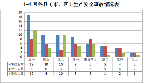 全市发生生产安全事故65起:恩平市19起,鹤山市10起,新会区10起,开平市9起,市直辖区16起,蓬江区5起,江海区4起,台山市2起。