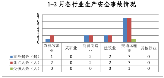 全市共发生生产安全事故12起,其中农林牧渔业1起、占8%,商贸制造业2起、占17%,建筑业2起、占17%,交通运输和仓储业7起、占58%。采矿业和其他行业未发生生产安全事故。