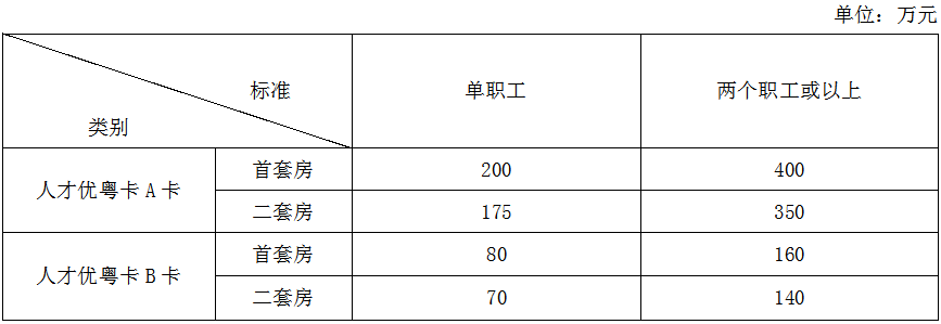 持有人才优粤卡的人才在我市购买首套和二套自住住房的,公积金最高贷款额度适度提高。其中,持有人才优粤卡A卡的,公积金最高贷款额度是我市公积金最高贷款额度的5倍;持有人才优粤卡B卡的,公积金最高贷款额度是我市公积金最高贷款额度的2倍。