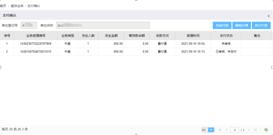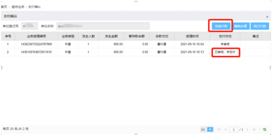 ①发起付款:可对已提交未付款的汇缴申请和已复核未付款的补缴申请进行付款。